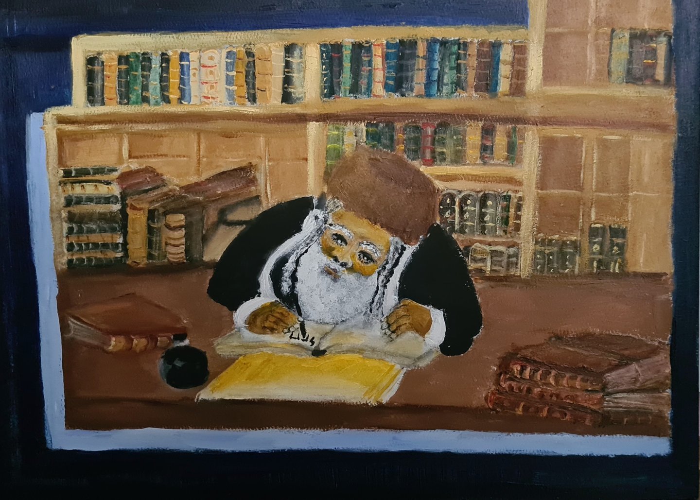 Rabbi bestudeert ook boeken, veelal wordt gelezen in de Synagoge (Sjoel) uit perkament(en)